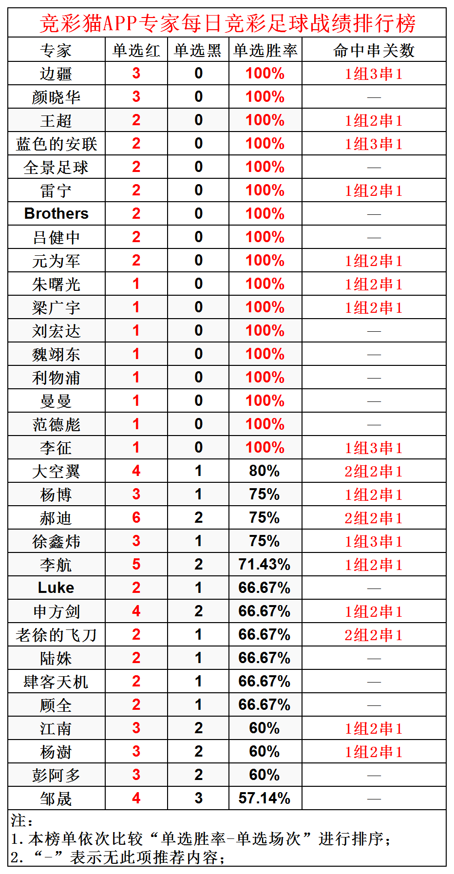 竞彩猫“Brothers”专区幸运星方面,“Mr.差不多”和“Mr.Silence”入选幸运星,两位网友推荐全部红单