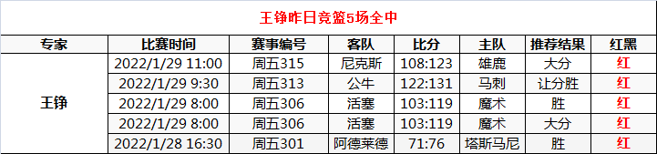昨日竞篮之星授予专家王铮。昨日王铮竞篮推荐5场全中,状态在线!