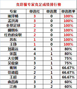 昨日竞足之星授予专家谢泽畅。昨日谢泽畅竞足推荐3场全红,状态稳定。