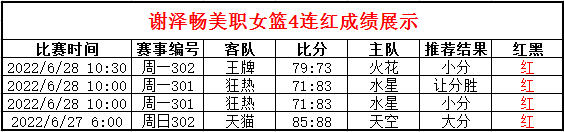 昨日竞篮之星授予专家谢泽畅。谢泽畅昨日成功命中了狂热71-83水星的让分胜以及小分,还有王牌79-73火花的小分,3场全红。目前谢泽畅美职女篮收获4连红。今日的竞篮推荐,谢泽畅的方案值得跟进!