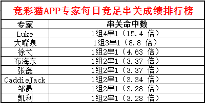 昨日竞彩猫多名专家命中串关,其中Luke命中15.4倍4串1,大嘴泉命中8.8倍3串1,徐弋、布海东、张磊、CaddieJack、邹晟、凯利均命中1组串关。今日的串关推荐,以上专家的方案值得参考!