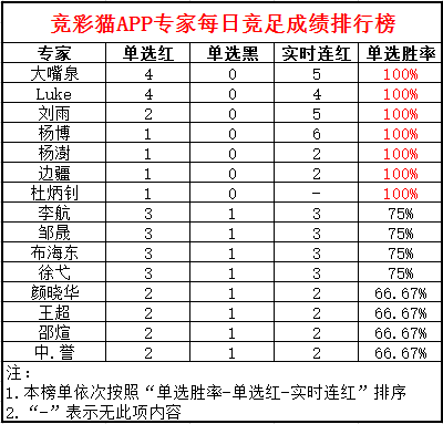 昨日竞足之星授予专家大嘴泉。大嘴泉在昨日进行的4场竞足赛事中全部命中,弹无虚发,同时命中了8.8倍串关。目前,大嘴泉的竞足推荐已经达成5连红。今日的竞足推荐,大嘴泉的方案值得持续关注!