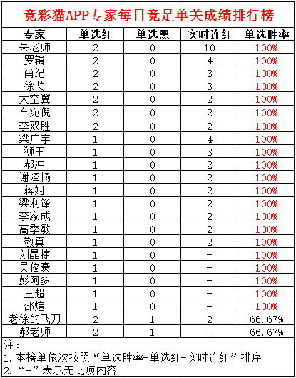 在昨日的单关赛事中,利物浦和水晶宫1-1握手言和,尤文图斯3-0大胜萨索洛,马竞客场3-0大胜赫塔费。竞彩猫专家朱老师发布其中2场比赛全部命中,目前单关已经达成10连红!罗辑、肖纪、徐弋、大空翼、车宛倪、李双胜2场全中,梁广宇、狮王、郝冲、谢泽畅、蒋娴、梁利锋、李家成、高季敏、敬真、刘晶捷、吴俊豪、彭阿多、王超、邵煊单场命中,老徐的飞刀、郝老师3中2。今日的单关赛事为格拉斯哥流浪者VS埃因霍温,以上专家的方案值得持续关注!