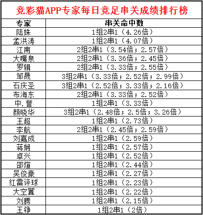 昨日竞彩猫多名专家命中串关,其中陆姝命中4.26倍2串1,孟洪涛命中4.07倍2串1,邹晟、石庆圣、颜晓华命中3组串关,江南、大嘴泉、罗辑、布海东、李航命中2组串关!今日的竞足串关推荐,以上专家的方案值得参考!