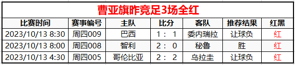 昨日竞足之星授予专家曹亚旗。曹亚旗昨日竞足分别为巴西1-1委内瑞拉的让负、智利2-0秘鲁的主胜以及哥伦比亚2-2乌拉圭的让负,3场全中、弹无虚发!今日的竞足赛事,曹亚旗的方案值得参考!