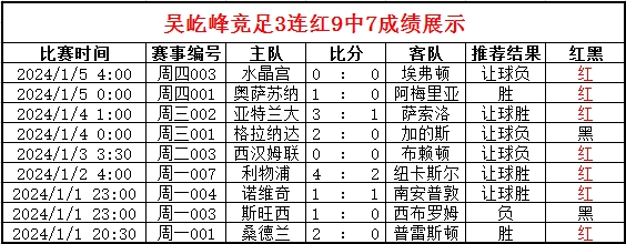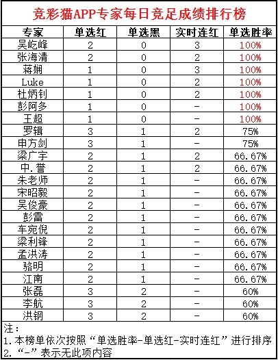 昨日竞足之星授予专家吴屹峰。吴屹峰昨日命中水晶宫0-0埃弗顿的让负以及奥萨苏纳1-0阿尔梅里亚的主胜,2场全红,实时3连红9中7!今日吴屹峰的竞足推荐值得关注!