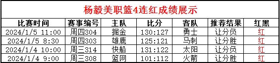 昨日竞篮之星授予专家杨毅。杨毅昨日命中掘金130-127勇士的让负以及雄鹿125-121马刺的让胜,2场全中,取得4连红。今日杨毅的方案值得跟进!