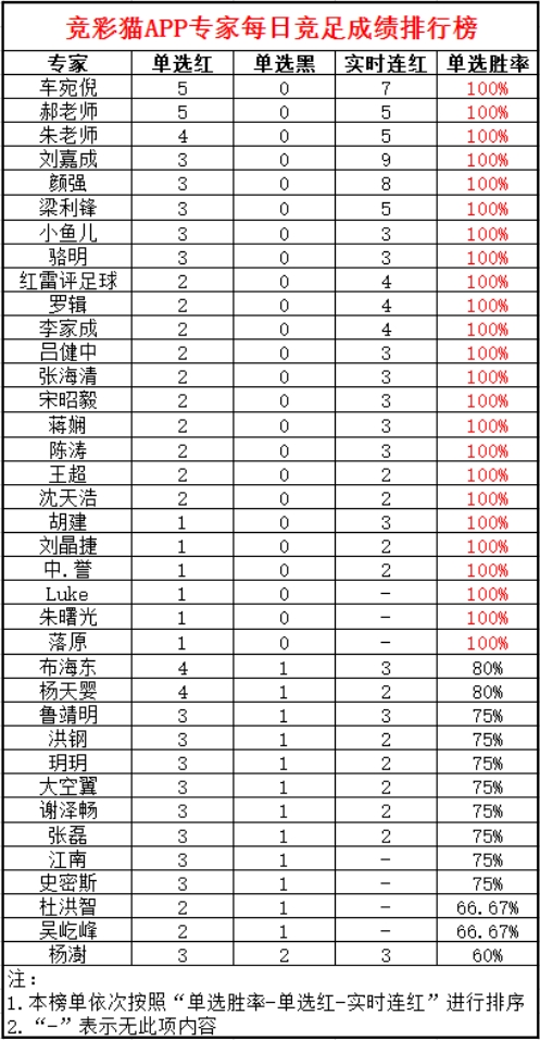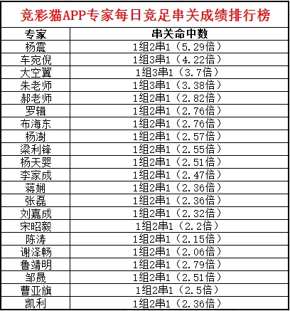 昨日多位专家命中串关,其中杨震、车宛倪、大空翼、朱老师、郝老师、罗辑、布海东、杨澍、梁利锋、杨天婴、李家成、蒋娴、张磊、李家成、宋昭毅、陈涛、谢泽畅、鲁靖明、邹晟、曹亚旗、凯利均命中1组串关。