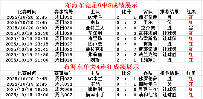 竞彩猫专家周榜(2025.10.13-2025.10.19)