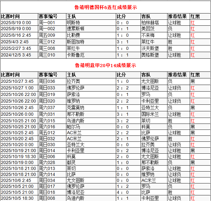 鲁靖明德国杯6连红 意甲20中14
