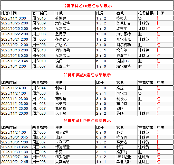 吕健中荷乙10连红 英超6连红 意甲7连红