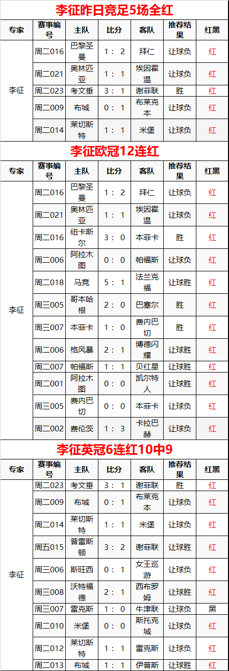 李征昨日竞足5场全红 欧冠12连红 英冠6连红10中9