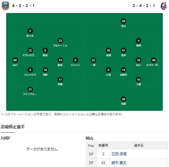 川崎前锋上轮做客0比2输给大阪樱花,近期在客场遭遇两连败。本赛季球队已经很难获得下赛季的亚冠资格,但剩余的比赛特别是主场还是会努力踢好的。本场球队的阵容很齐整。与此同时,冈山绿雉作为升班马已经基本保级了,后卫立田悠捂和铃木喜丈都停赛。上一次碰面,川崎做客打平冈山。本场我看好主胜!
