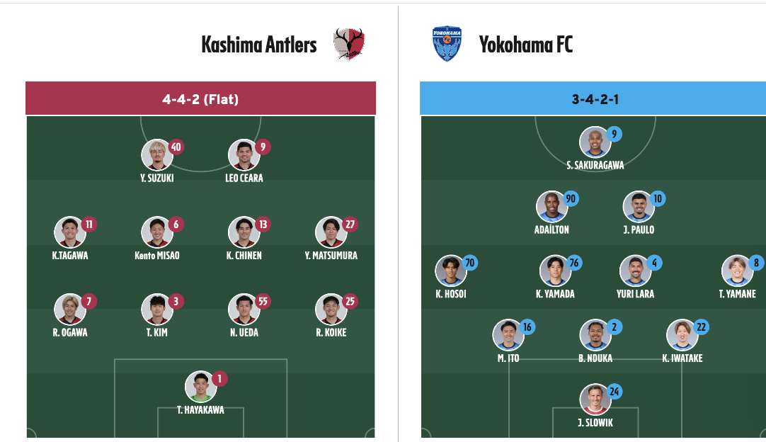 鹿岛鹿角上轮客场1比1战平京都不死鸟,联赛遭遇三连平。球队在关键阶段的疲软表现让领先优势仅剩1分。但是由于神户也没有赢球,他们实际上还是保持住了优势。今天首发来看,核心锋线由铃木优磨与塞阿拉搭档。铃木优磨本赛季已贡献10球5助攻,是球队进攻端的灵魂人物;塞阿拉则以18球领跑射手榜,但近三场陷入进球荒。安西幸辉、关川郁万与师冈柊生三名后防与中场主力还是打不了。今天的变化是田川亨介首发,顶替了察克里奇。