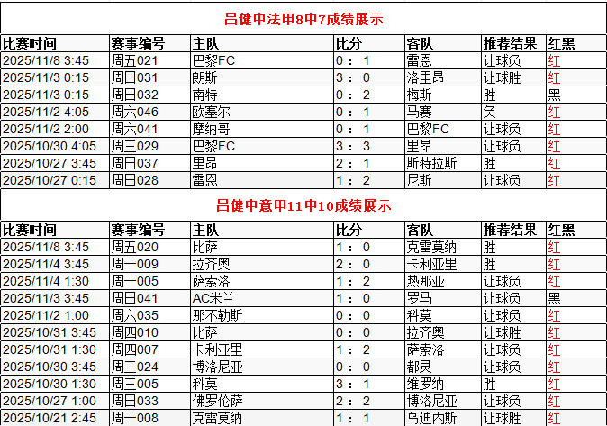 吕健中法甲8中7 意甲11中10