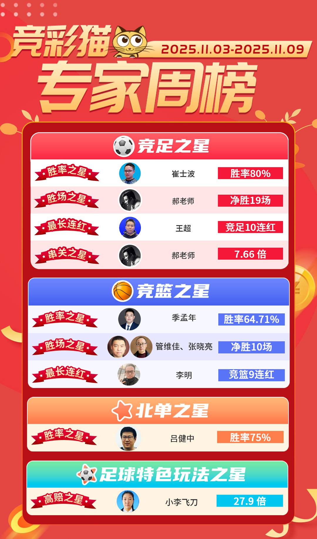 在过去的一周时间(11月3日-11月9日),中国竞彩足球一共开出211场比赛,中国竞彩篮球开出82场比赛。无论竞彩比赛如何开出,总是难不倒专家们的火眼金睛。专家周榜的上榜条件为:竞足、竞篮及北单胜负过关单周分析场次≥10场,周榜分为:竞足胜率之星、胜场之星(红单场数-黑单场数)、串关之星、最长连红;竞篮胜率之星、胜场之星(红单场数-黑单场数)、串关之星;北单胜负过关胜率之星;足球特色玩法高赔之星;篮球特色玩法高赔之星。(注:由于上周竞篮赛事较少,竞篮单周分析场次≥8场即可上榜)
