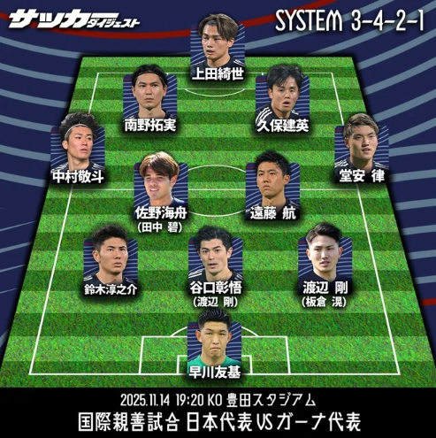 日本在上一场友谊赛中主场3比2逆转了巴西,也是队史首次击败桑巴军团。本期国家队比赛日,日本将迎战“非洲黑星”加纳,主教练森保一也是召入了全部精英球员,包括久保建英、上田绮世和南野拓实等人。边锋三笘薫继续因伤缺阵。加纳过往4次做客日本1胜3负处于下风,两队最近一次碰面是2022年的友谊赛,当时日本主场4比1大胜加纳。非洲球队对友谊赛的态度存在疑问,更何况加纳本身实力也不如日本。让胜!