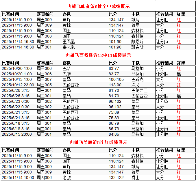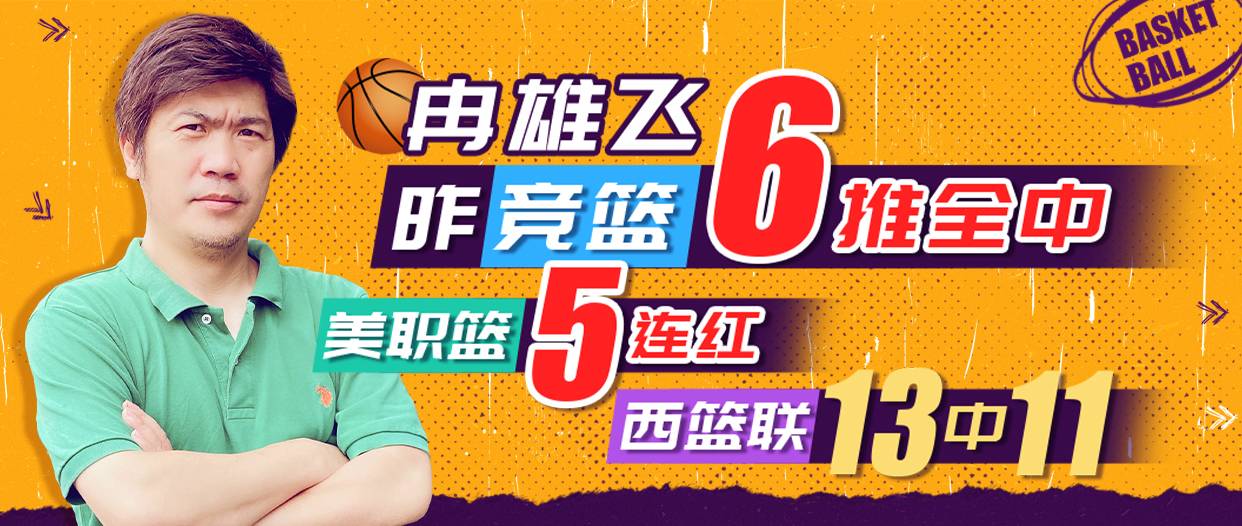 昨竞篮6推全中 美职篮5连红 西篮联13中11!昨日