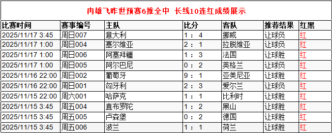 冉雄飞昨日世预赛6场全红 长线10连红