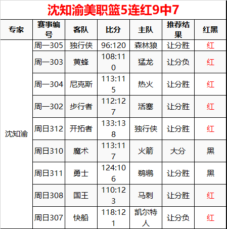 术业专攻 沈知渝昨美职篮4场全红 实时5连红9中7