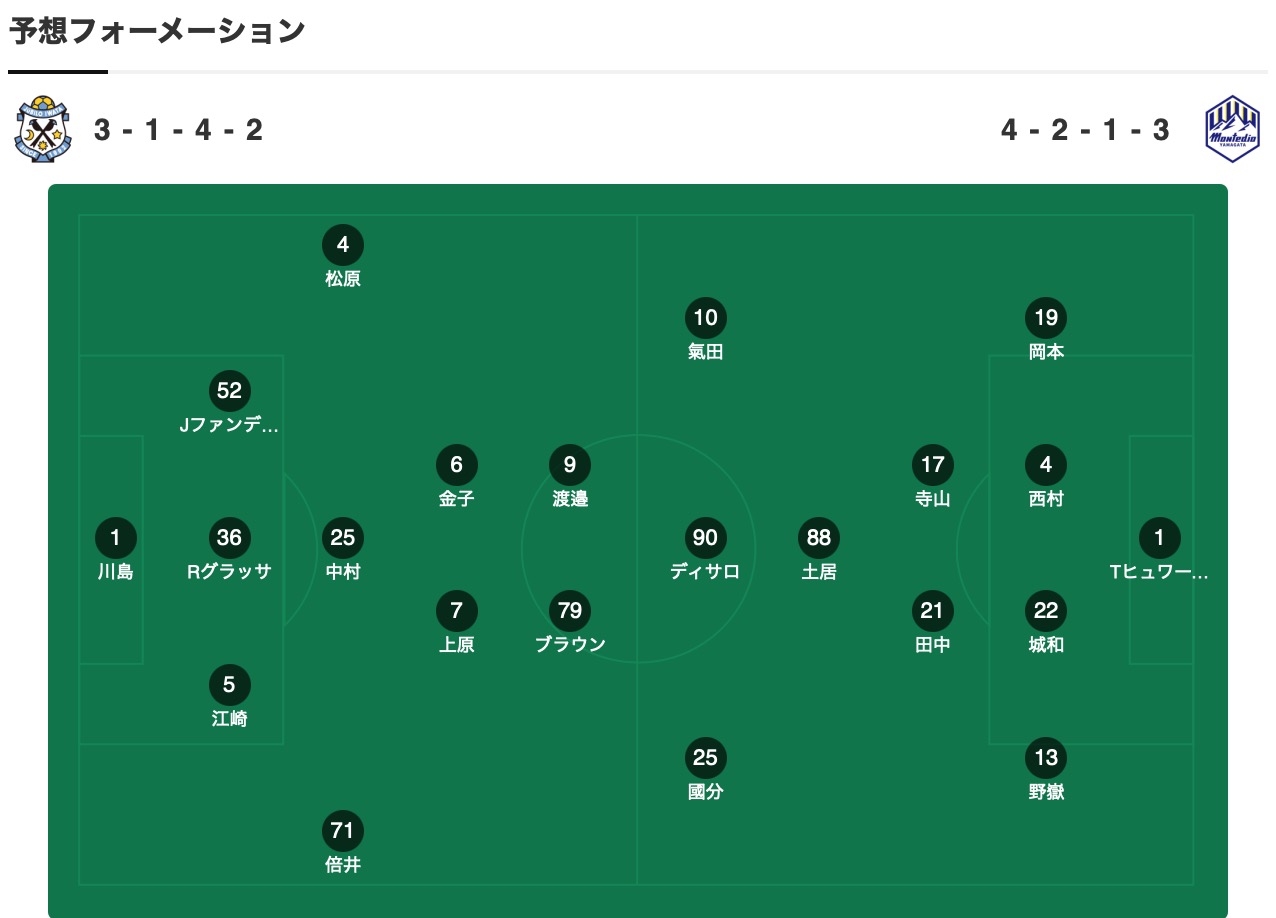 磐田山叶上轮客场2-1击败雷法山口,近期取得了3连胜状态有所回升,新帅安间贵义上任后带队5轮4胜1负,目前在积分榜排名第7位落后身前的德岛漩涡和仙台维加泰1分,在还有两轮的情况下依然有机会获得升级附加赛资格,最后一轮将客场对阵鸟栖沙岩,本场阵容上后卫上夷克典、主力中场為田大貴、替补川合徳孟、相田勇樹出战有一定疑问。