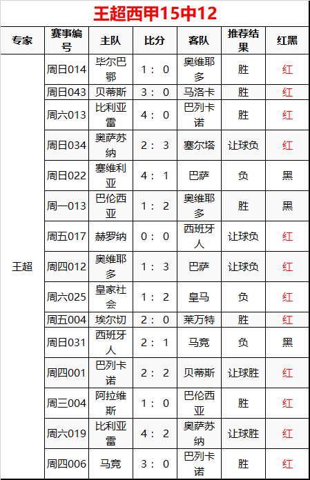 王超西甲15中12 关注:巴列卡诺VS巴伦西亚