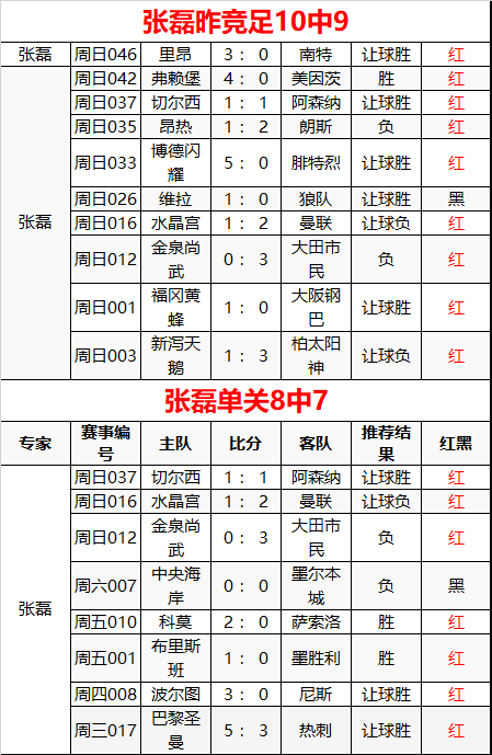张磊昨日竞足10中9 单关8中7