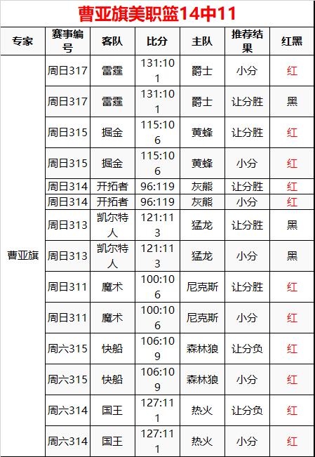 曹亚旗昨美职篮10中7 长线14中11 今日三场全解读