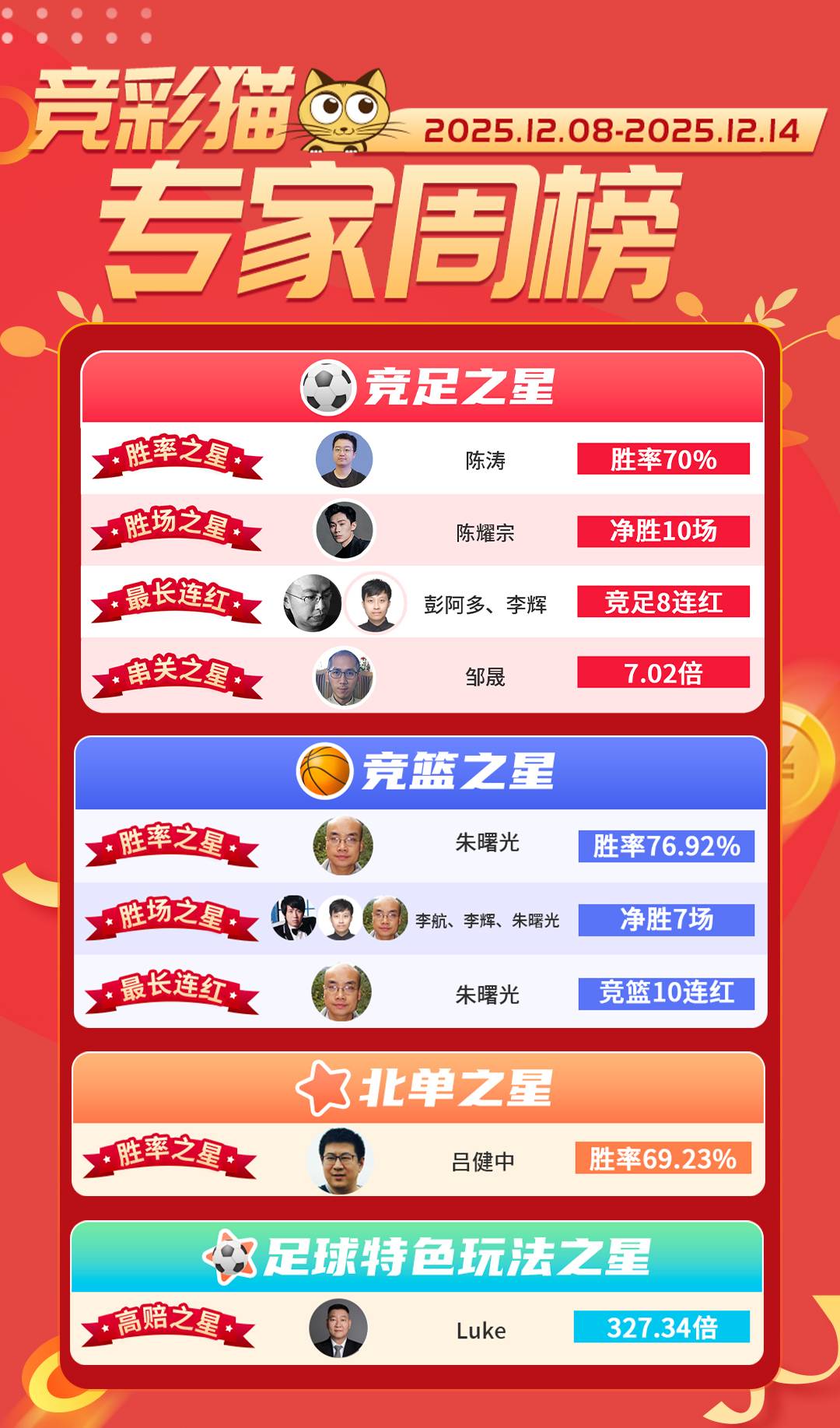 竞彩猫专家周榜(12月8日-12月14日)