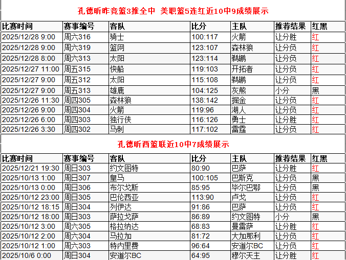 昨竞篮3场全中 美职篮5连红近10中9 西篮联近10中7 点击→