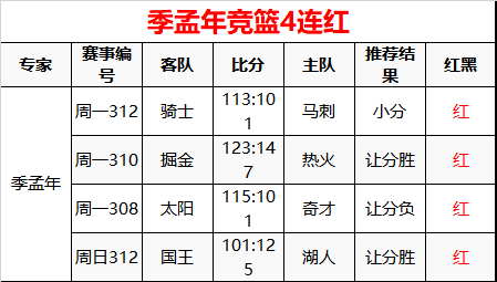 季孟年昨日竞篮3场全红 实时4连红