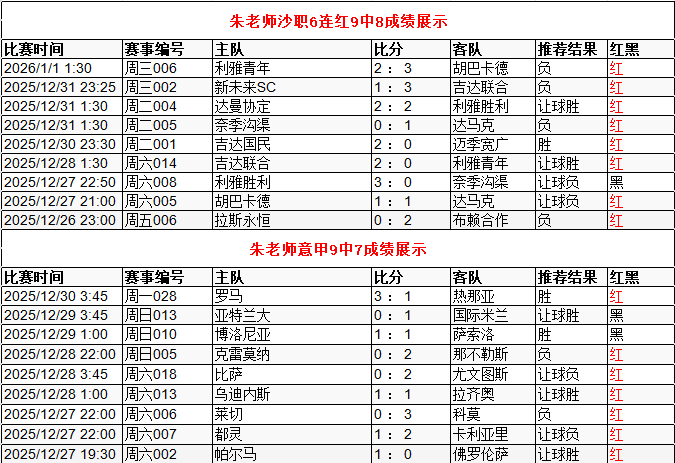 朱老师沙职6连红9中8 意甲近9中7