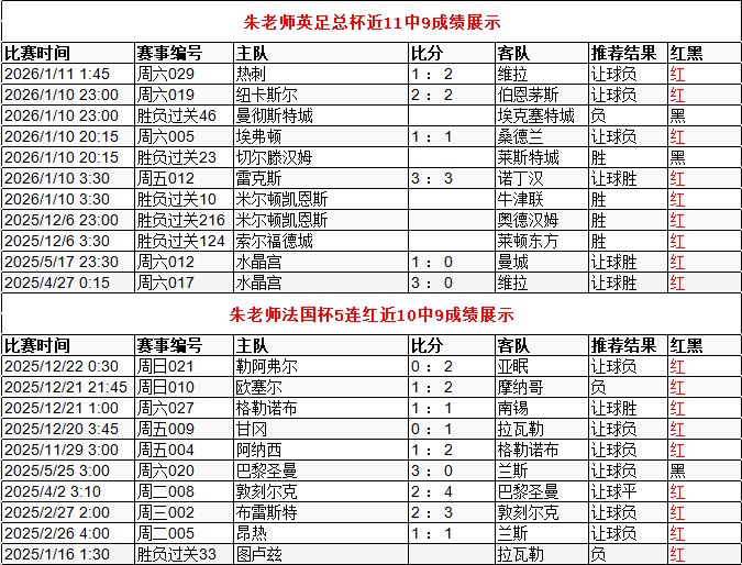 朱老师法国杯5连红10中9 英足总杯近11中9