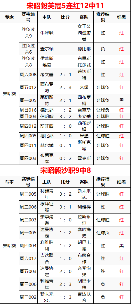 宋昭毅英冠5连红12中11 沙职9中8