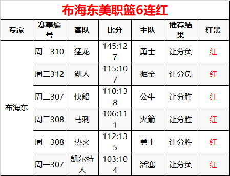 布海东连续两日美职篮全红 实时6连红