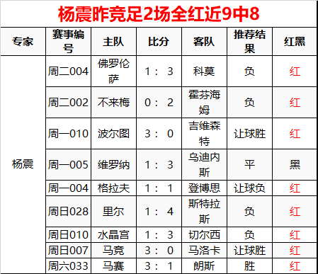 杨天婴昨竞足3场全红 长线10中7 单关5连红