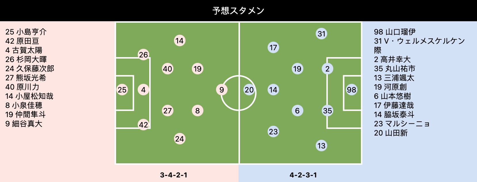柏太阳神联赛首轮客场1-0击败福冈黄蜂,新帅罗德里格斯采用了3421的打法,全场球队共有750次传球在当轮排名榜首,战术风格的变化还是非常明显,防线上本赛季新加盟的小島亨介、杉岡大暉、原田亘都是首发出战,虽然需要磨合但还是实现了零封,门将小島亨介表现出色。中前场原川力、小泉佳穂、久保藤次郎、仲間隼斗等新援也是首发表现中规中矩,下半场替补登场的垣田裕暉和迭戈联袂打入全场唯一进球,不过全场罗德里格斯只用了三个换人名额。本场球队的阵容变化不大,而且目前也没有伤病的影响,预计还是会延续上一场的人员配置。