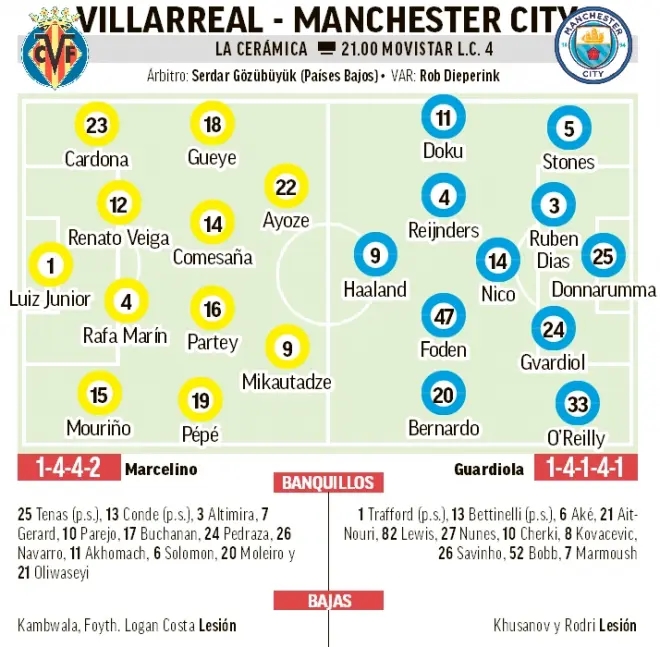 比利亚雷亚尔上轮联赛在主场2比0领先的情况下被皇家贝蒂斯2比2追平,曼联旧将安东尼梅开二度,最后时刻实现绝平。人员方面,福伊特、坎布瓦拉、洛甘-科斯塔都因伤缺阵。曼城方面,上轮欧冠做客2比2冷平摩纳哥,而在上轮联赛中,他们在主场2比0击败埃弗顿,哈兰德梅开二度,延续了开赛以来不错的状态,只不过最后时刻连续3次浪费良机,未能上演帽子戏法。此外,中场金球险胜罗德里和乌兹别克斯坦后卫胡桑诺夫都因伤缺阵。两队上一次在欧冠中遭遇还是2011-12赛季,当时曼城在主客场完成双杀,本场走正路。