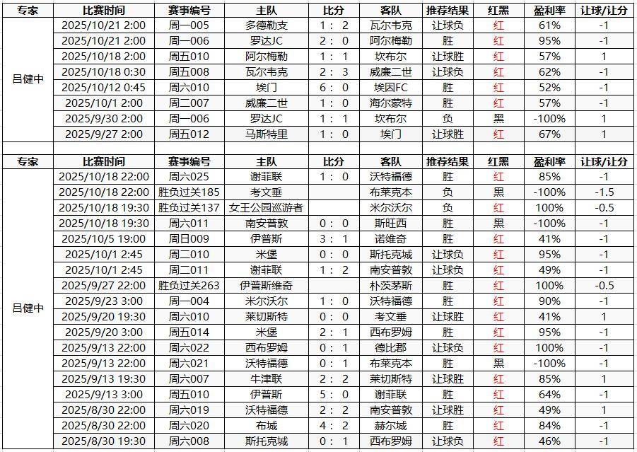 布海东 欧冠5连红10中9 单关5连红 关注今日瑞士轮多场焦点战