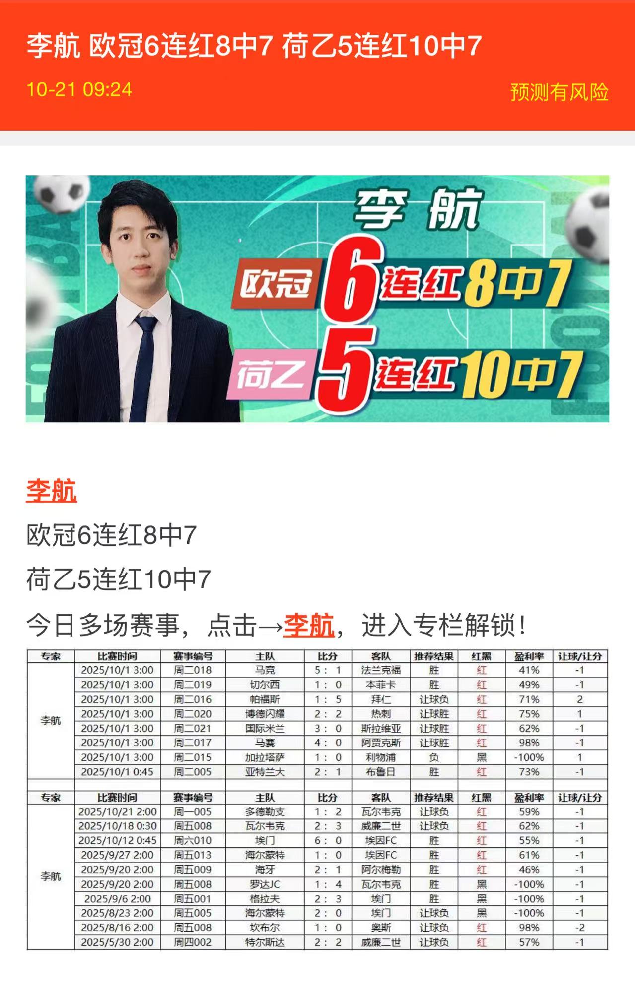 昨天周一,比赛难度比较大,整体情况不太理想,好在【每日信心串】打出。今天早场有多场亚冠,晚上还有9场欧冠,其中欧冠咱们6连红近8中7。此外,荷乙也有5连红,大家可以侧重关注。感谢支持,祝好运!