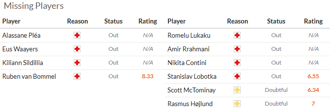 那不勒斯上轮联赛做客0比1爆冷输给都灵,领头羊位置已经被AC米兰抢走,目前球队和国际米兰等队同分。人员方面,锋霸卢卡库、中场洛博特卡和后卫拉赫马尼、孔蒂尼都因伤缺阵,丹麦前锋霍伊伦和苏格兰中场麦克托米奈都缺席了上轮联赛,他们对球队很重要,尤其是麦克托米奈,本场两人均出战成疑。