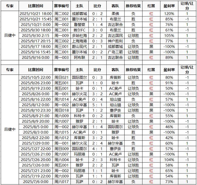 吕健中 亚冠精英6连红9中7 芬超20中14