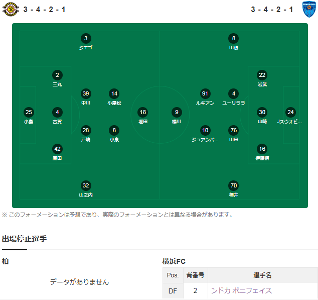 柏太阳神上轮做客5比0大胜大阪钢巴,进攻端火力全开。联赛还剩最后4轮,柏太阳神落后领头羊鹿岛鹿角3分,完全有机会夺冠,后者本轮做客京都不死鸟,丢分的可能不小。中场主将渡井理己本场因伤缺阵。横滨FC上轮主场2比2绝平名古屋,球队已经尽力了,但还是落后安全区2分,看起来他们再次降入日乙的可能性很大。混血后卫博尼费斯本场停赛,此前他出场34次打进1球。综合考虑,本场我力挺柏太阳神拿到3分。