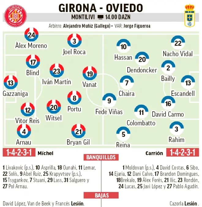 赫罗纳上轮踢的不错,但还是在客场1比2输给了巴萨,最后时刻被乌拉圭后卫阿劳霍绝杀。目前球队1胜3平5负,和本场对手奥维耶多并列最后一位。即便已经带队多年,赫罗纳主帅米歇尔的帅位也进入到讨论期,如果本场不胜,下课也不要奇怪。人员方面,戴维-洛佩斯和荷兰名将范德贝克等人因伤缺阵。奥维耶多开局不佳后果断换帅,保诺维奇下课,卡里翁上任。本场40岁的老将卡索拉继续因伤缺阵。让负,搏单平!
