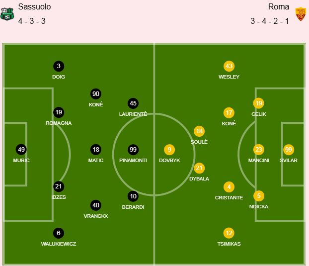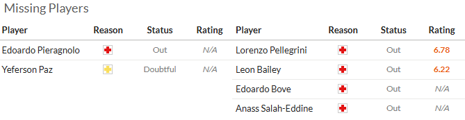 萨索洛这次重返意甲后表现比较平稳,上轮球队做客0比0打平莱切,目前3胜1平3负。本场球队阵容很齐整。罗马周中在欧联杯中主场0比1不敌捷克球队比尔森,但只要本场获胜,他们就能追平昨晚在主场3比1击败国际米兰的那不勒斯,并列积分榜的首位。拜利、博维和埃迪内继续因伤缺阵。客胜不热,值得一搏!