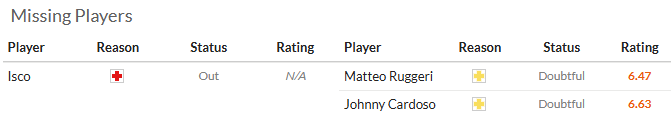 皇家贝蒂斯上轮做客2比0落后比利亚雷亚尔,但靠着巴西球星安东尼的梅开二度压哨追平比分。周中欧联杯做客对阵比利时球队亨克,双方最终0比0握手言和。伤病情况倒是还好,只有前欧洲金童伊斯科继续因伤缺阵。马竞方面,上轮联赛在主场1比0小胜奥萨苏纳,但周中欧冠做客酋长球场0比4惨败。不得不说的是,马竞本赛季各项赛事6个客场3平3负没赢过。后卫鲁杰里和后腰卡多索大概率因伤缺阵。综合考虑,搏客胜!