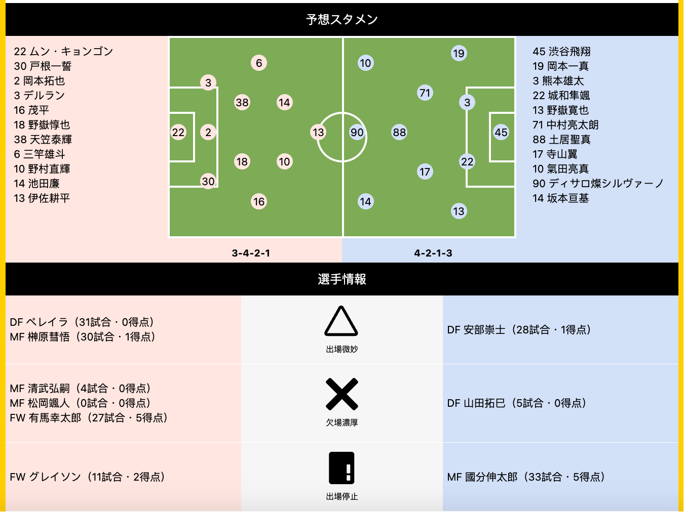山形山神上轮联赛是打平了大公松鼠,最近4轮联赛不败,不过这个赛季对于他们来讲也是已经没有了升级的空间,在尾声阶段给了更多的替补球员或者说年轻球员机会。阵容本场比赛他们受损更大,中场核心國分伸太郎停赛,没人能够代替他的位置,后卫安部崇士以及山田拓巳都打不了。