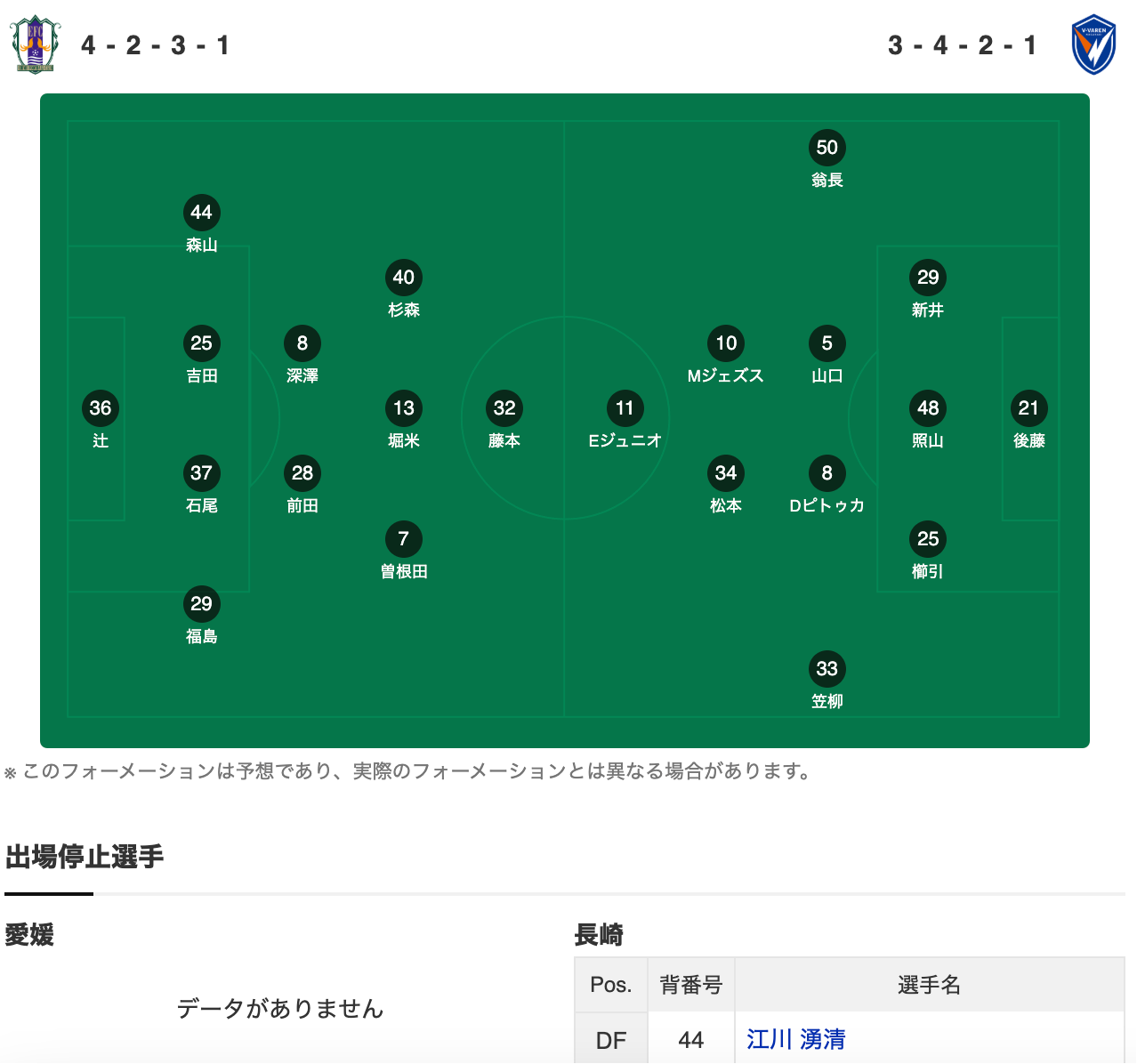 长崎上场比赛是输给了磐田,他们结束了从6月开始的16场不败的记录,那么目前在积分榜上和领头羊水户的积分差距已经是拉到了4分。不过这场比赛他们先踢,如果能够击败对手的话,肯定还可以给水户施加更大的压力,一切皆有可能。从阵容的角度出发,除了几名老伤号之外,不过他们的中卫江川湧清是需要停赛,锋线上外援都是能够出场,热苏斯搭档儒尼奥尔。