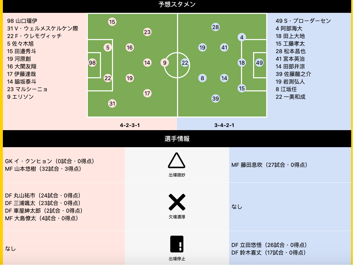 川崎前锋上轮联赛是输给了大阪樱花,这场比赛球队比赛的动力确实不太足,不过考虑到他们最后主场还有两场比赛,球队还是希望能够用胜利来在联赛的尾声收官。阵容上来讲,其实目前阶段他们并没有太多的问题,还是后卫丸山祐市以及三浦颯太等几名老伤号,唯一有疑问的是中场山本悠樹本周一直在单独训练,如果他不参赛的话,橘田健人以及大関友翔出场也是能够做到补充,问题不大。