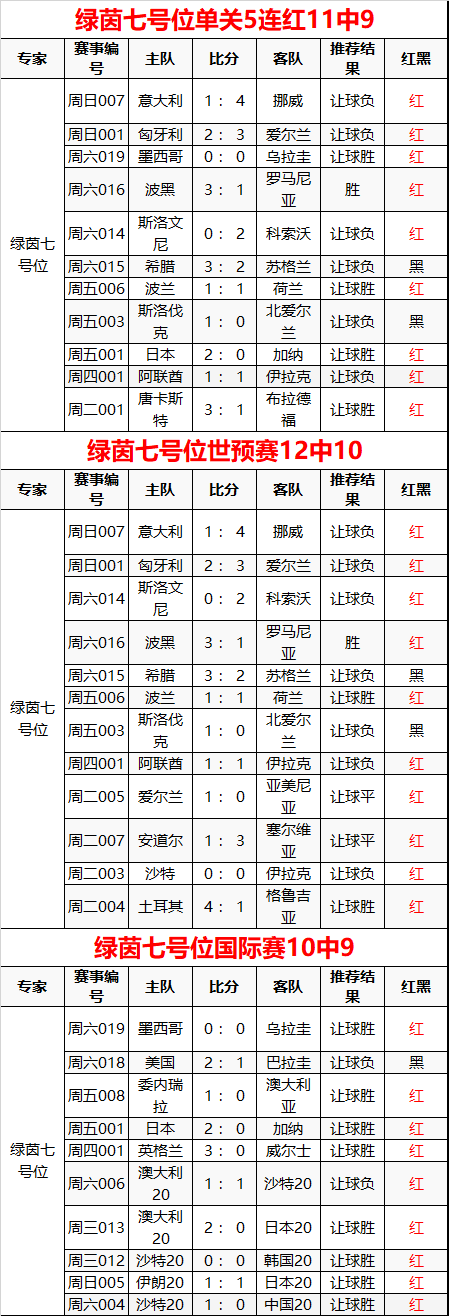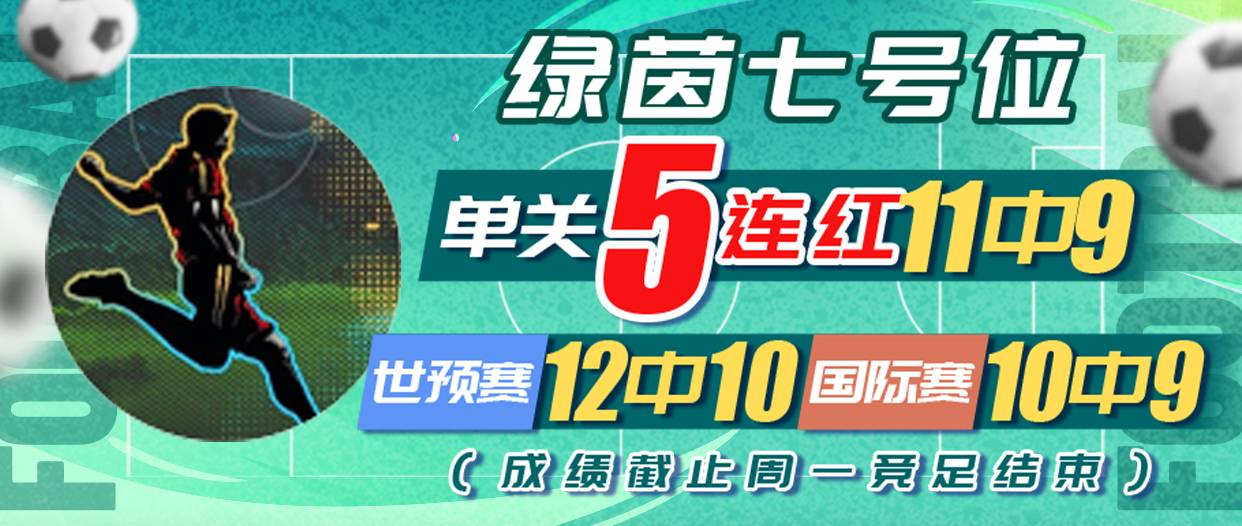 绿茵七号位单关5连红11中9 世预赛12中10 国际赛10中9 (成绩截止周一竞足结束)